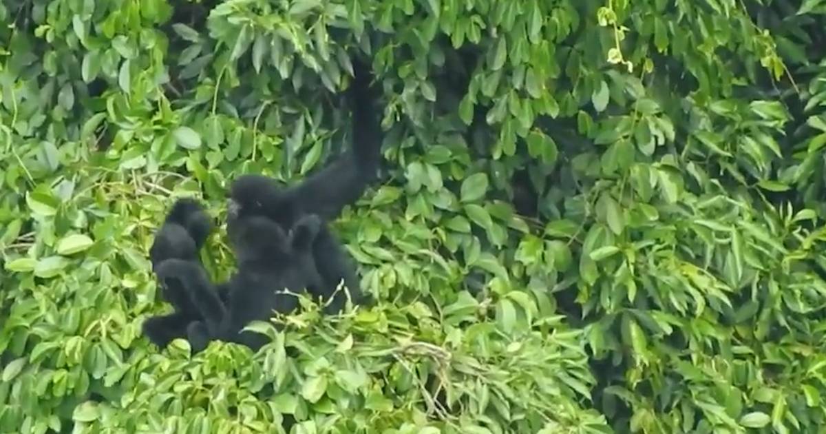 Il filmato mostra due gibboni più anziani che giocano con uno più giovane. Quest'ultimo cade all'improvviso. Il trio è stato avvistato da un drone in una foresta vicino al confine vietnamita-cinese. Si tratta di tre esemplari maschi di Nomascus nasutus, perché hanno il pelo nero. Le femmine hanno la pelliccia marrone.