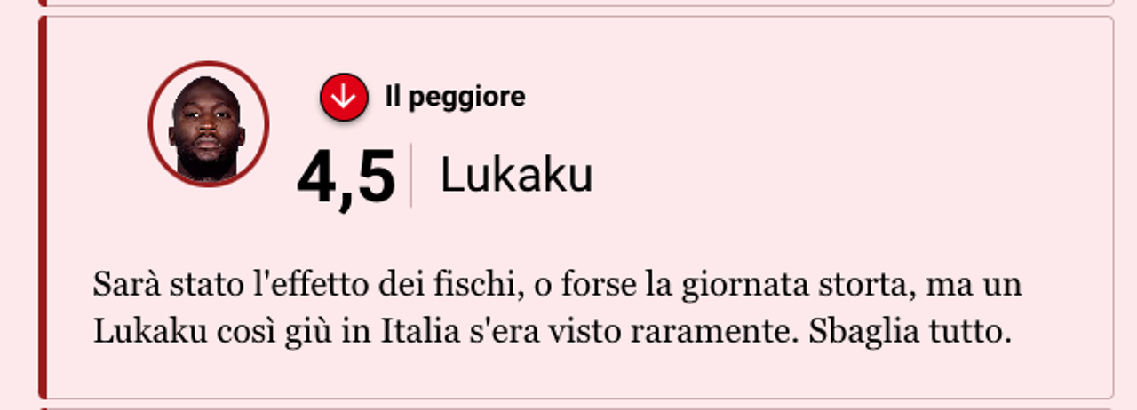 Quindi i punti non erano male: 4,5 su 10. “Forse è stato il fischio dell’arbitro, o forse la giornata storta, ma Lukaku caduto così si è visto raramente in Italia”, spiega il quotidiano. “Ha fatto tutto male.”