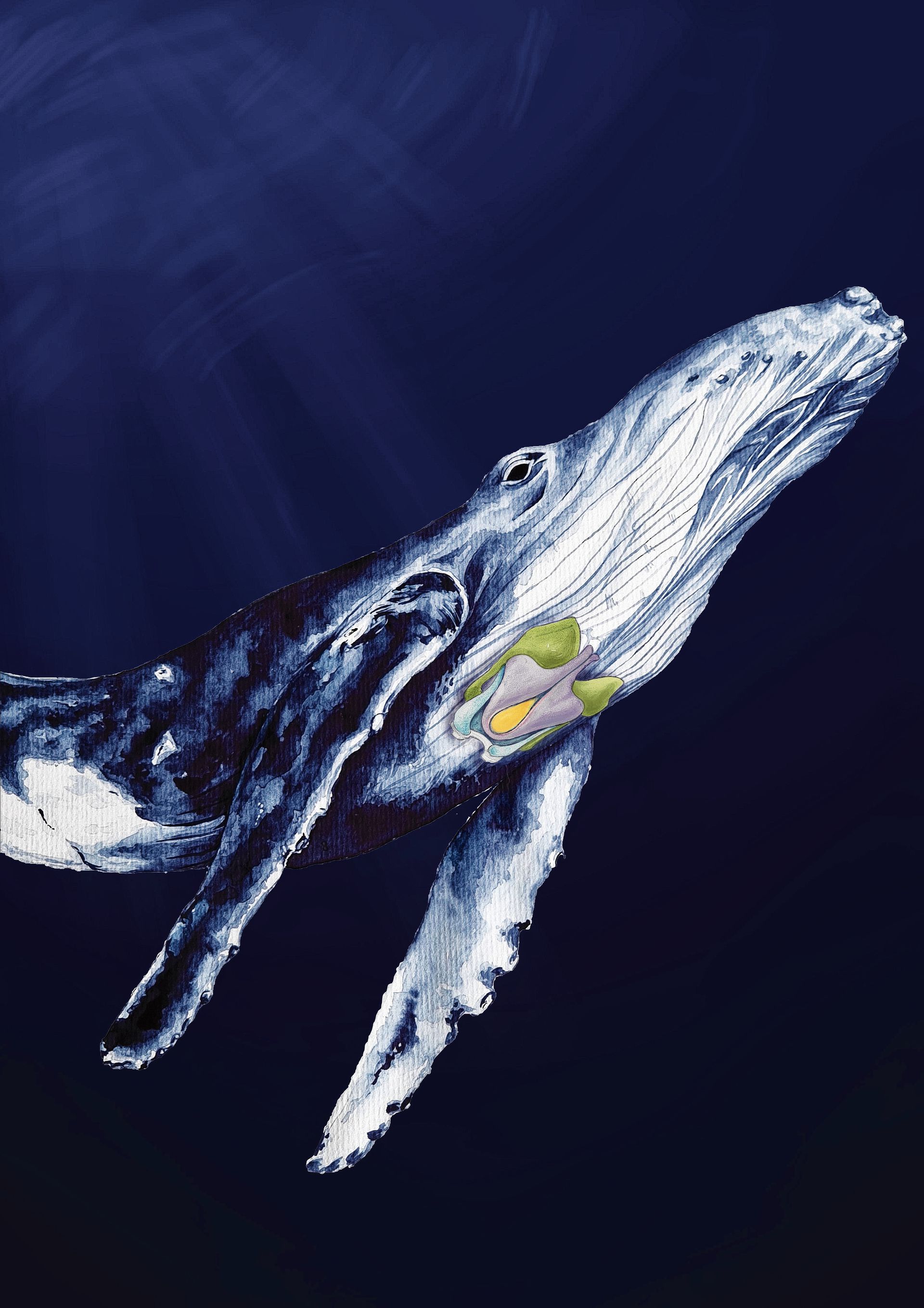 La coloratissima megattera ti guarda con un aspetto quasi umano. megattera (Megatteri novangeli(appartiene al gruppo dei misticeti)Misticità). Come suggerisce il nome, queste balene non hanno denti ma piuttosto fanoni; Piastre a forma di spazzola filtrano il plancton e i piccoli pesci dell'oceano.