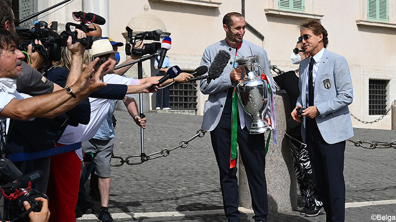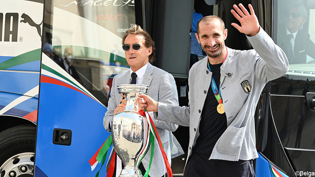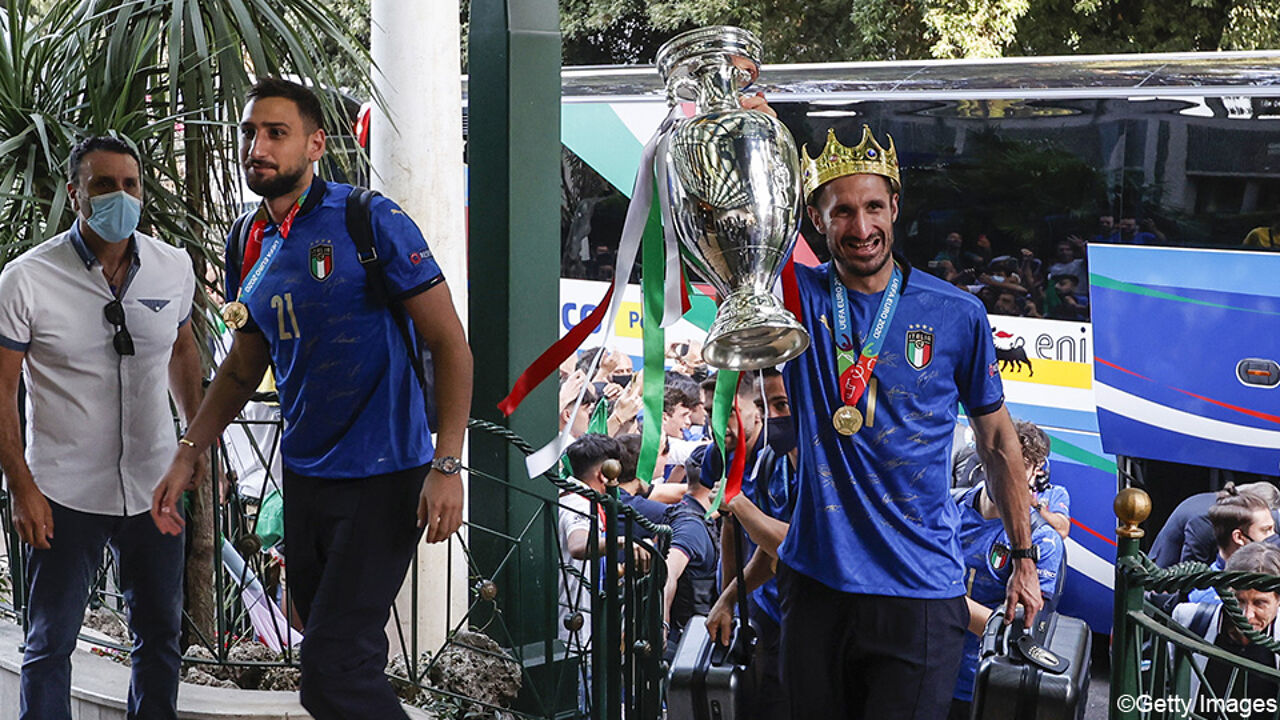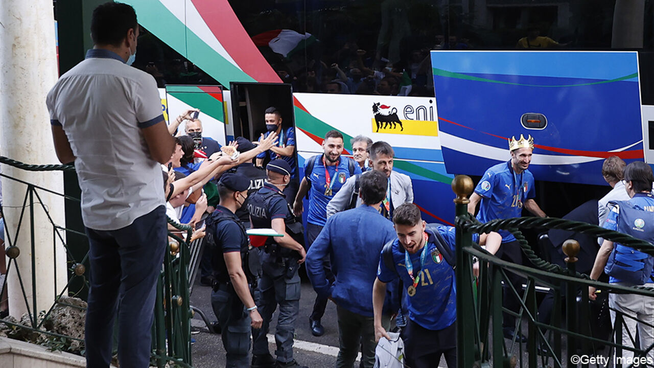 Per gli italiani è stata una giornata intensa con molte feste e celebrazioni. Sono arrivati all’aeroporto di Roma alle sei del mattino. Il tecnico della Nazionale Roberto Mancini e il capitano Giorgio Chiellini hanno alzato insieme il trofeo dopo aver lasciato l’aereo Alitalia.
